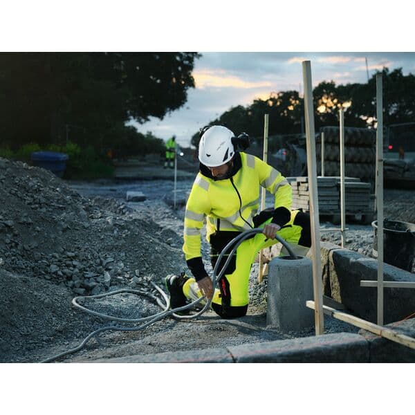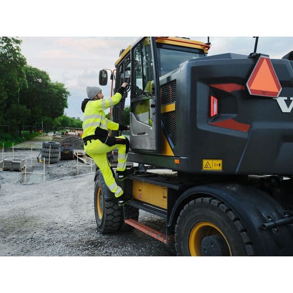 Elastisk arbeidsbukse med smal passform laget for daglig bruk på arbeidsplasser med krav om høy synlighet. Elastisk materiale og formsydde ben gir god komfort og bevegelsesfrihet. Hovedmateriale: 100 % polyester (36 % Sorona polyester), 225 g/m2. Kontrast: 88 % polyamid, 12 % elastan. Forsterkning 1: 100 % polyamid-CORDURA, 275 g/m2. Forsterkning 2: 100 % polyamid, 290 g/m2.