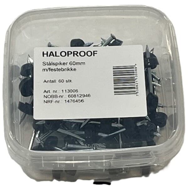 Varenummer: 60812946HALOPROOFHALOPROOF STÅLSPIKER 60MM M/FESTEBRIKKE 60 STK