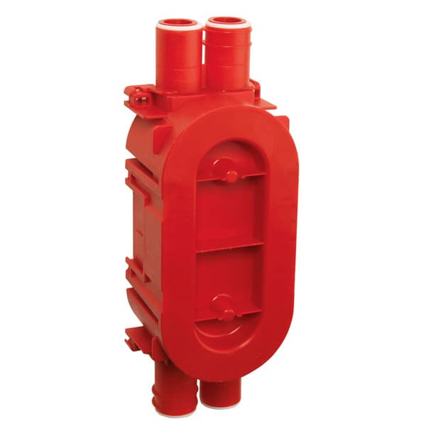 Dobbel apparatboks for montering i skivevegger med enkel- eller dobbel gips. Utstyrt med 4 stusser for 16 og 20 mm rør. Leveres med forhøyningsring 6 mm. Brand- og lydklassifisert iht ny standard.