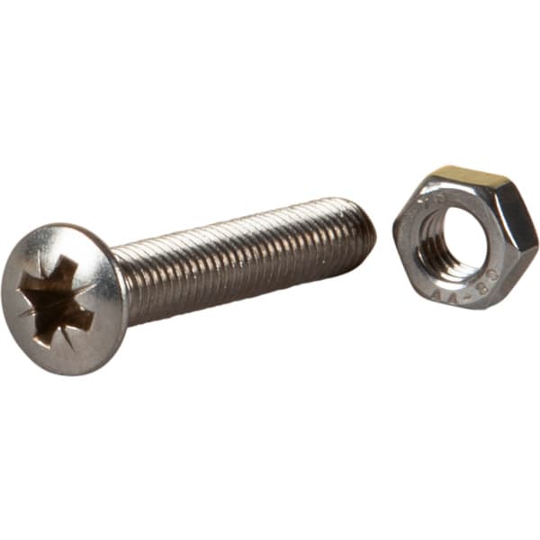 Maskinskrue med mutter har sylinderisk krysspor, og syrefast A4 overflatebehandling.