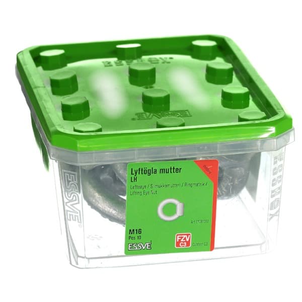 ESSVE Ringmutter skal skrus hardt mot underlaget. Dersom det skal benyttes to ringmuttere kan være nødvendig å legge skiver mellom flens og underlag for å få ringmuttere i samme plan. LH følger DIN 582 og kommer i herdet stål med varmforsinket overflatebehandling for utendørs bruk.