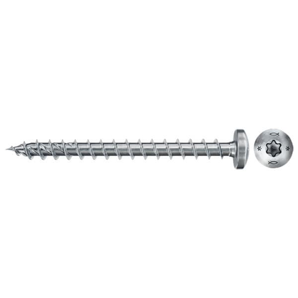 fischer treskrue PowerFast FPF II PTF BZ er en bonus zink skrue med panhode, TX spor og helgjenger. Panhodet med TX spor garanterer optimal kraftoverførsel med maksimal bit stabilitet. Det runde hodet gjør den svært godt egnet til feste av metall mot tre f.eks. beslag, skinnesamlere eller stolpesko. Skruen med helgjenger muliggjør høyere belastning pga. lengre gjenger.