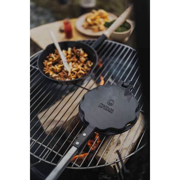 Tradisjonell modell i støpegods med langt stålskaft og håndtak av tre. Legges på grillristen eller direkte på bålet. Leveres med eget etui.