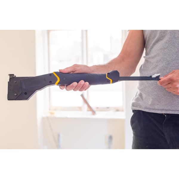 Stiftehammer som gjør det mulig å lagre 3 stiftepinner for 50% mer kapasitet. Den har en lett og holdbar design. Gummiformet håndtak for komfort og langvaring bruk. Automatisk låsing. AntiJam klemlås for pålitelig og enkel betjening. Drop in loading gjør det enkelt å laste i stifter. Passer til 6-14mm stifter og 15mm 18GA stifter.