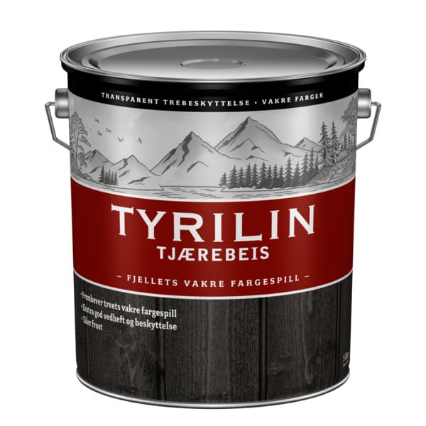 TYRILIN TJÆREBEIS er en transparent høykvalitets trebeskyttelse som gir ett transaprent fargespill og et eksklusivt utseende på treverket. Er basert på naturproduktet tretjære som er blandet med utvalgte alkydoljer. Beisen trenger godt inn i treverket og gir en vannavvisende overflate. Inneholder sopphindrende midler. TYRILIN TJÆREBEIS egner seg svært godt på hus, hytter, gjerder/detaljer i kledningspanel, villmarkspanel eller laftet tømmer. Skal påføres rett på treverket, uten behov for grunning.