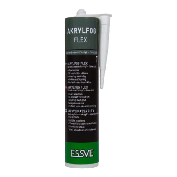 ESSVE AKRYL FLEX WHIT Er Overmalbar og fleksibel fugemasse for innen- og utendørs bruk. Svært fleksibel masse for tetting og fuging inne og ute. God vedheft mot de fleste byggematerialer.