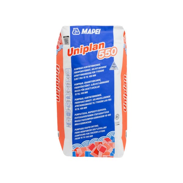 Pumpbar, hurtigtørkende, fiberforsterket, sementbasert, selvutjevnende avrettingsmasse for sjikttykkelser fra 15 til 100 mm pr. sjikt. UNIPLAN 550 er en selvutjevnende avrettingsmasse beregnet for innendørs bruk til avretting i tykkere sjikt av nye eller eksisterende underlag, eller flytende gulv, egnet for flytende parkett og laminat, fliser og naturstein.