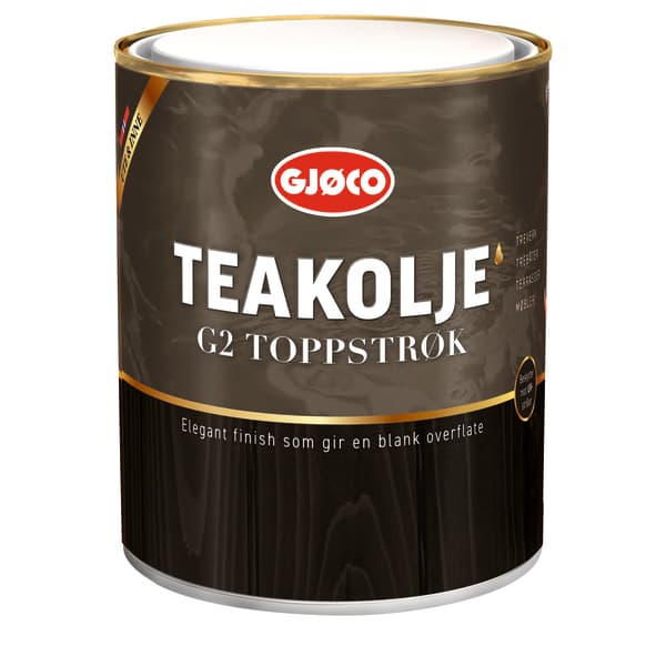 Gjøco Teakolje G2 Toppstrøk er en fargeløs, spesialimpregnering som erstatter lakkbehandling. Er vannfast og slitesterk. Brukes som toppstrøk, sammen med Gjøco Teakolje G1 på trebåter over vannlinjen, både utvendig og innvendig.