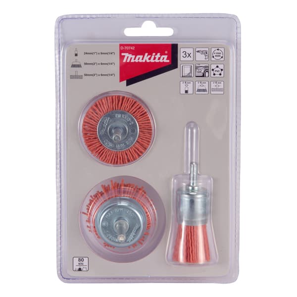 Varenummer: 57382216MakitaNylonbørstesett D-70742 6mm 3 deler K80 Tre, PVC, metall