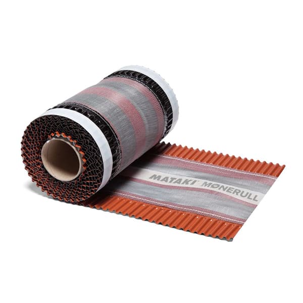 Tetting og ventilering av møne og valm. Ventilasjonsduk i midten med striper av korrugert aluminium på sidene. Klebestriper av butyl på hver side.