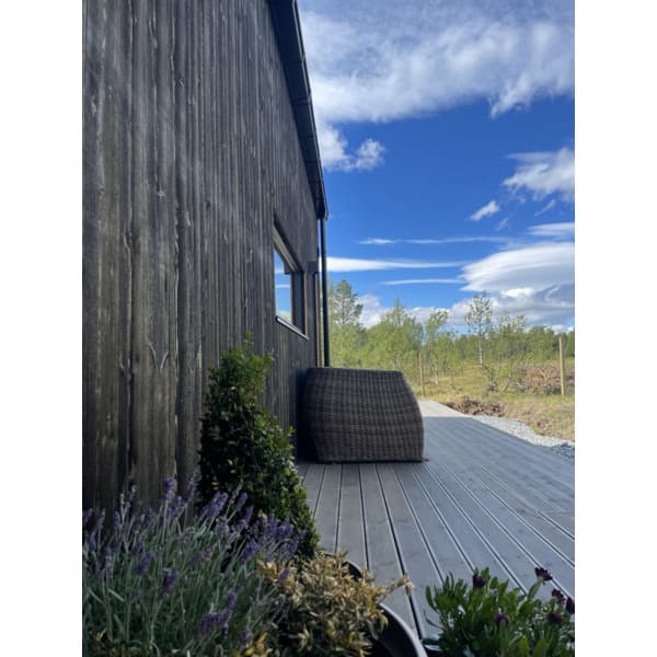 Vår Duo terrasse, har en rillet rettside og en glatt høvlet bakside. Den benyttes i hovedsak til terrassegulv, men kan også brukes til rekkverk trapper o.l. Terrassebord legges med noen mm avstand, slik at vann kan renne ned og opptørking kan skje fra alle sider. Forbruk: ca 8,2lm pr m2 Alvdal Royal behandlet terrasse er vedlikeholds vennlig, relativt formstabil og har lang levetid. Behandlingen er en 2 trinns prosess hvor materialene først impregneres (kl AB) for deretter å kokes i royal olje. Dette gir et UV beskyttet produkt med transparent farge, nyanser skapes avhengig at trestruktur. Vi anbefaler syrefaste festemidler samt at alle snittflater etterbehandles med Alvdal Royal olje.